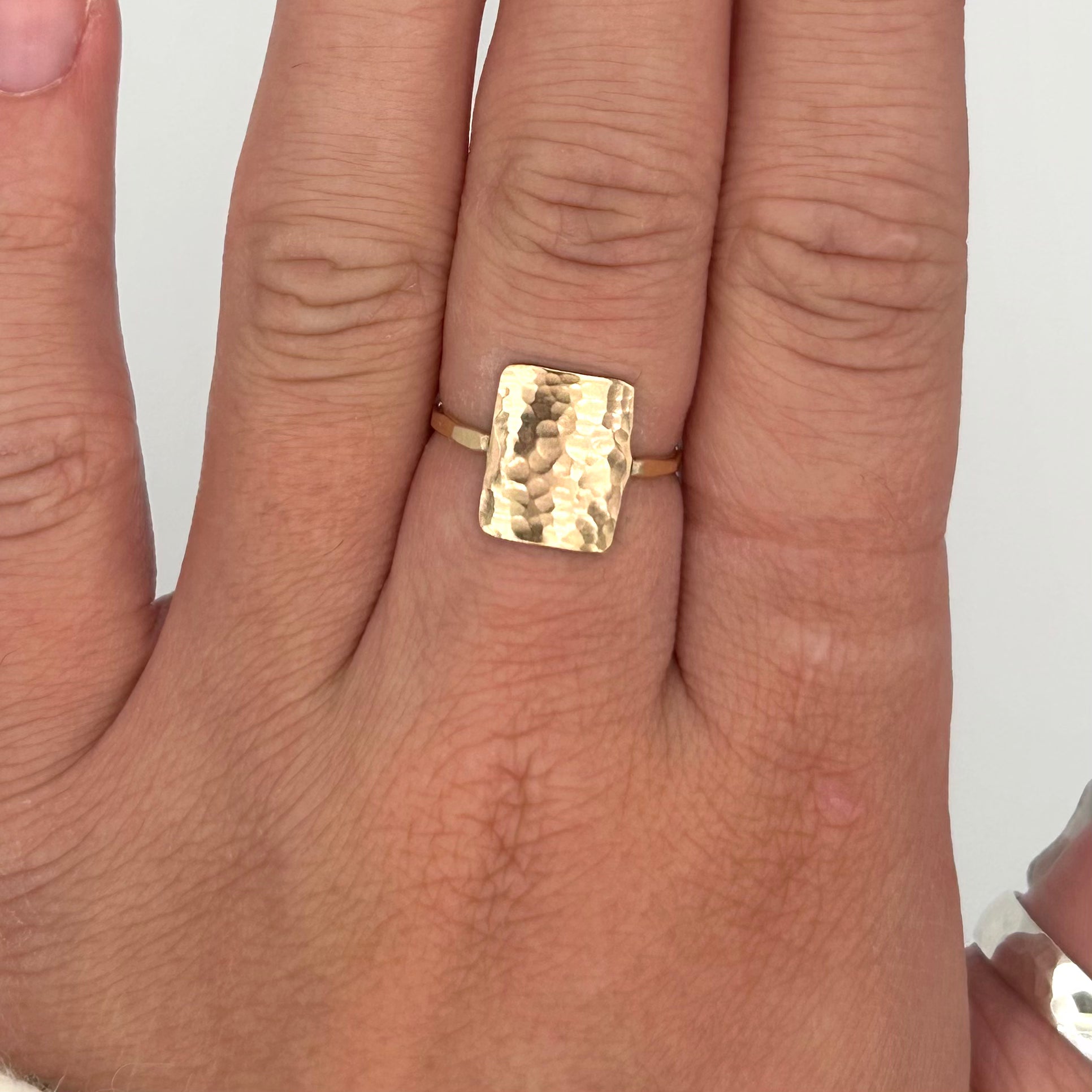 Crafted from a mix of delicate sterling silver and durable gold fill, this hammered rectangle ring offers a stunning blend of elegance and resilience. The unique hammered texture adds character and depth, making it a standout piece for any jewelry collection. The perfect accessory for any occasion.