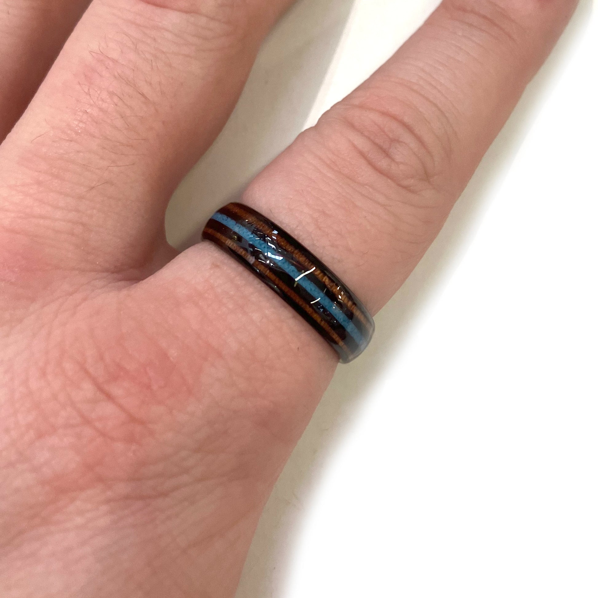 Expertly crafted with tungsten carbide, this black ring features genuine turquoise chips and a beautiful Koa wood inlay for a unique and durable accessory. With superior strength and style, this ring is perfect for any occasion.