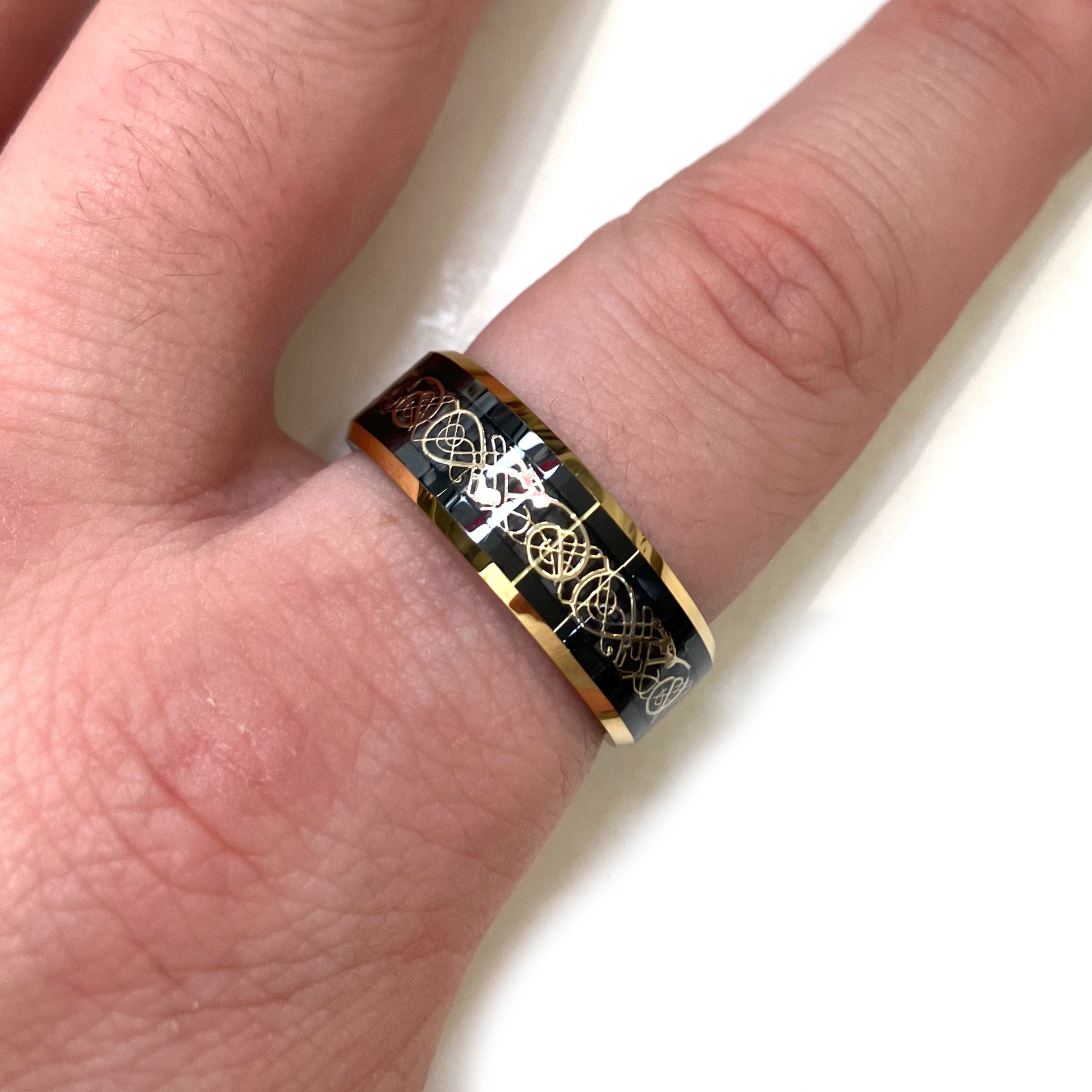 As a product expert, I can confidently present Tungsten Carbide 722. This black ring with a striking gold Celtic inlay is made of durable tungsten carbide. With its impressive strength and scratch-resistant surface, this ring ensures long-lasting wear and style. Complete your look with this unique and sophisticated piece.