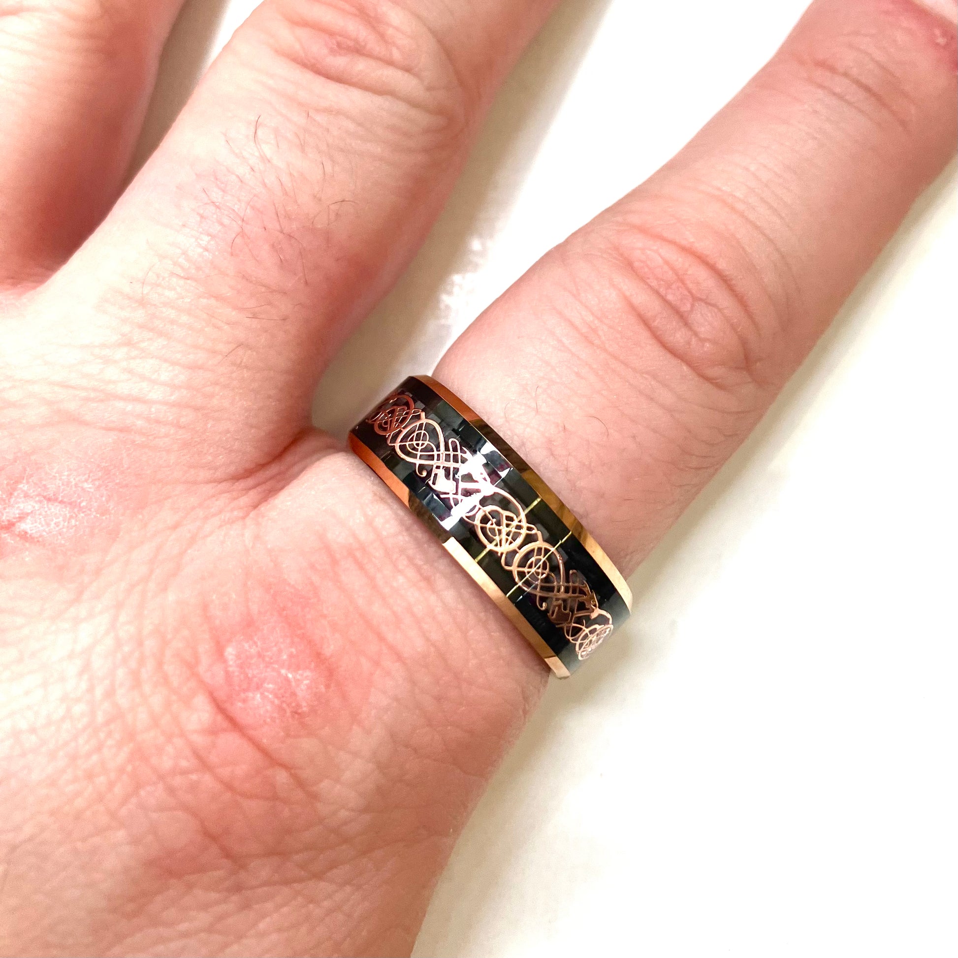 Expertly crafted with Tungsten Carbide, this black ring features a stunning Rose Gold Celtic Inlay. The durable material and intricate design make it a unique and stylish choice. Enhance your outfit with this sleek and modern accessory.