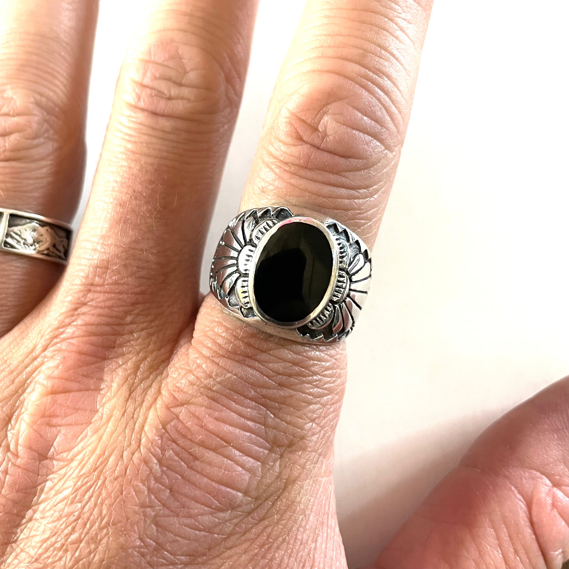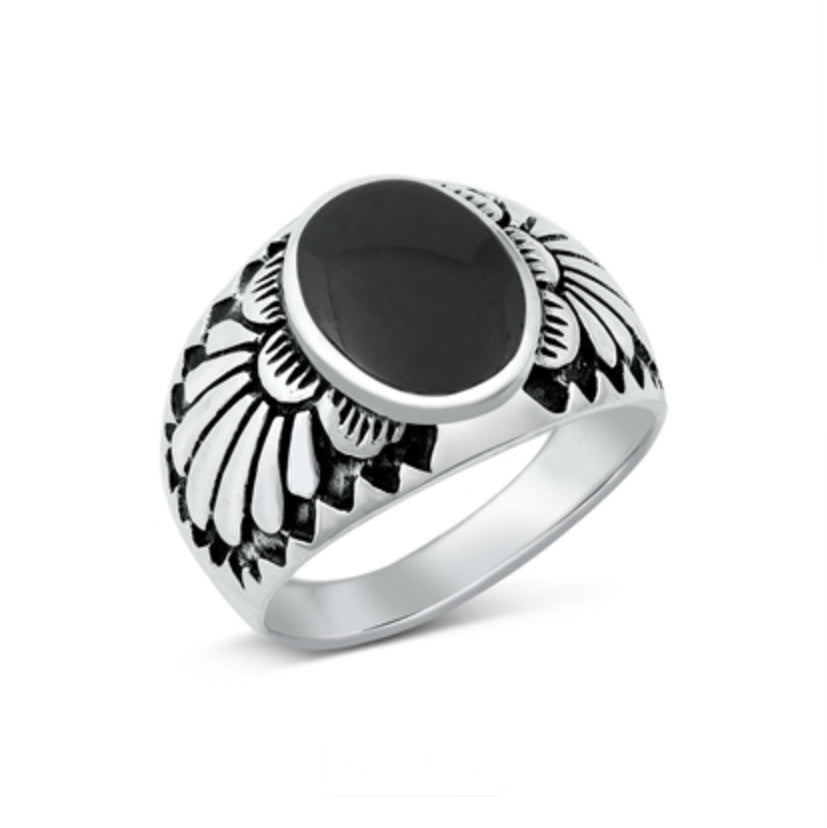 This Onyx Ring features a stunning Onyx Stone and is handcrafted with Sterling Silver and an Indian Feather. The unique combination of natural materials makes this ring a one-of-a-kind accessory. Elevate your style with the natural beauty and craftsmanship of this Onyx Ring.