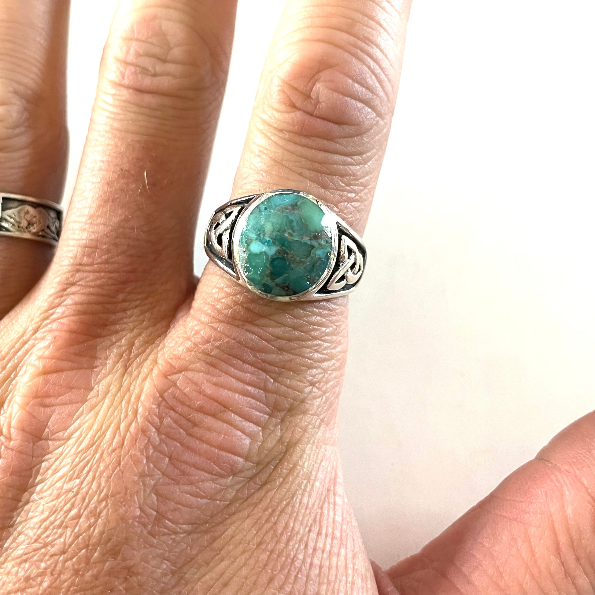 This elegant ring features a genuine turquoise stone set in sterling silver, adorned with a unique Celtic knot design. The stunning combination of genuine turquoise and intricate Celtic knot adds a touch of sophistication to any outfit. Expertly crafted and sure to make a statement.
